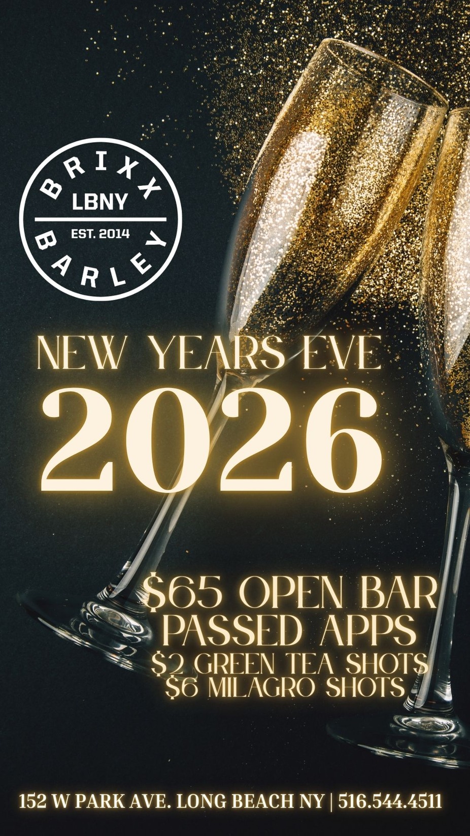 Celebrate the New Year with us and join us on New Year's Eve! $65 Open Bar Package Available 9PM-12:30AM. Includes Passed Apps. Does Not Include Tax + Gratuity. Call us now to reserve your spot or ask about details!
